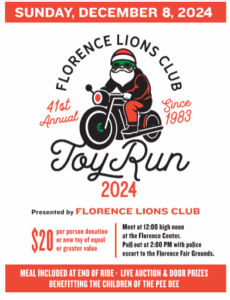 The big finale comes up Sunday, Dec. 8th at the 41st annual Florence Lions Club Toy Run, kicking off at 12 noon at the Florence Center!